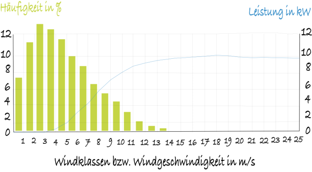Die dargestellte Grafik der Windklassenverteilung und der Anlagenkennlinie ist charakteristisch für den Bereich der Kleinwindkraft. Gerade in den häufig auftretenden Windgeschwindigkeitsklassen ist die Ausbeute an Leistung der Kleinwindkraftanlage gering bis gar nicht vorhanden. Das liegt an der zu geringen Höhe, in der die Kleinwindkraft errichtet wird.